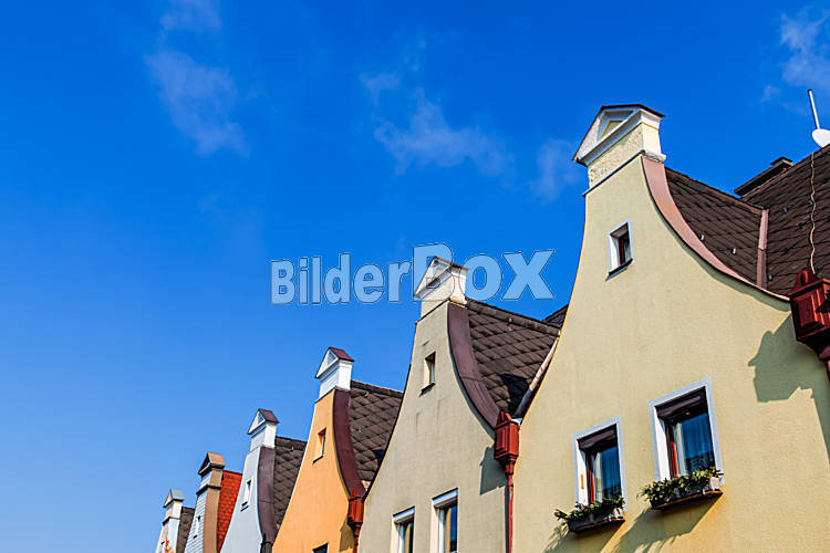 Beschreibung Stadthäuser mit traditionellem Giebel, Symbol für Wohnen, Altbau, Altstadt