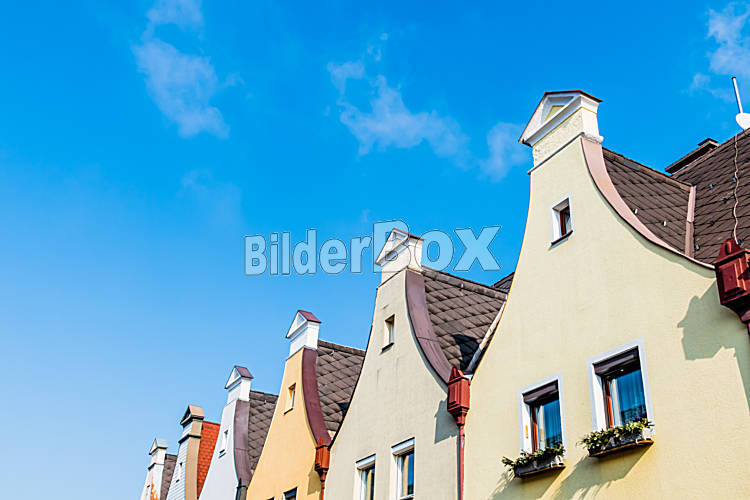 Beschreibung Stadthäuser mit traditionellem Giebel, Symbol für Wohnen, Altbau, Altstadt