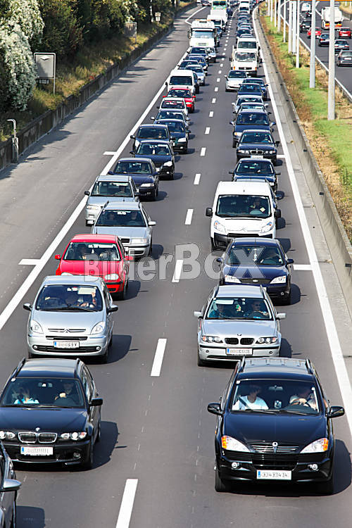 Beschreibung Stau im Verkehr mit Autos auf einer Autobahn Strasse