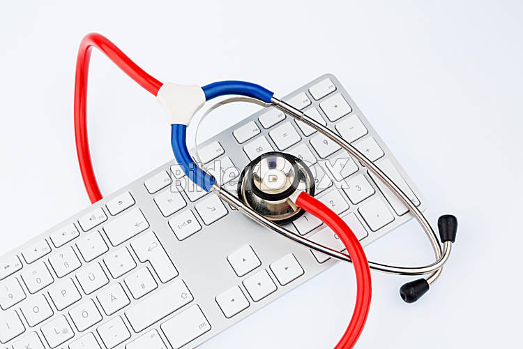 Beschreibung Stethoskop und Tastatur eines Computers, Symbolfoto für Diagnostik und Terminverwaltung