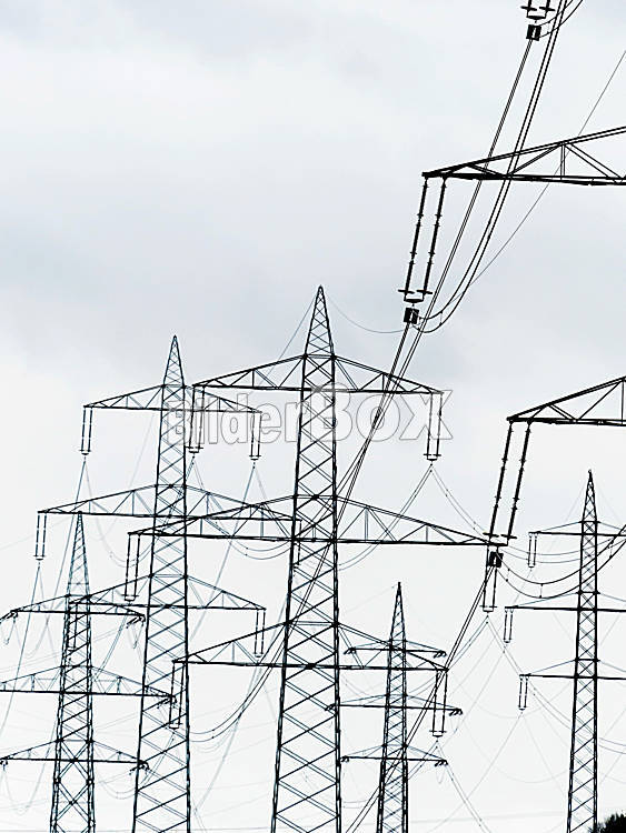 Beschreibung Der Mast einer Hochspannungsleitung für elektrischen Strom vor dunklen Wolken.