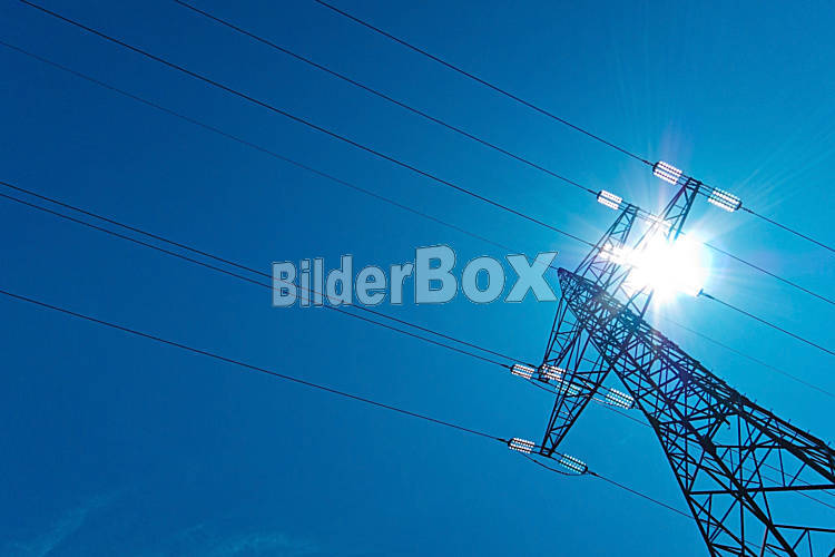 Beschreibung Der Strommast einer Hochspannungsleitung mit Sonne und blauem Himmel. Energieversorgung durch Stromleitung.
