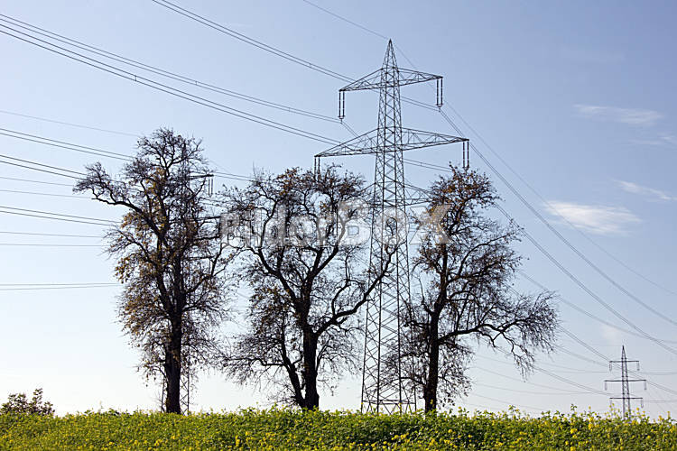 Beschreibung Masten einer Stromleitung hinter Bäumen