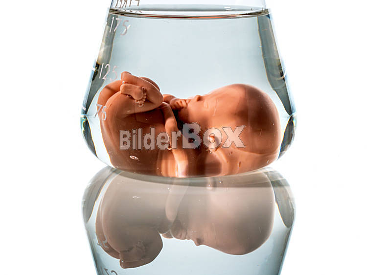 Beschreibung Modell eines Embryos in einem Laborglas. Symbolfoto für Schwangerschaft durch künstliche Befruchtung. Abtreibung und Genmanipulation
