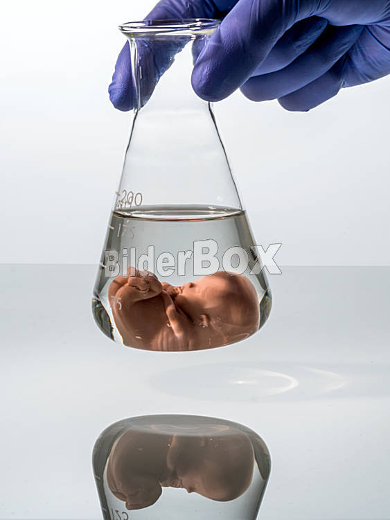 Beschreibung Modell eines Embryos in einem Laborglas. Symbolfoto für Schwangerschaft durch künstliche Befruchtung. Abtreibung und Genmanipulation