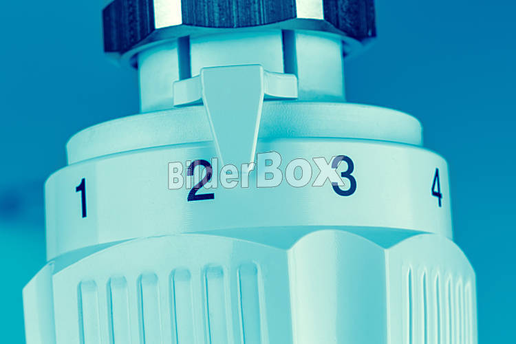 Beschreibung Der Thermostat eines Heizkörpers ist wenig aufgedreht. Niedrige Raumtemperatur spart Heizkosten