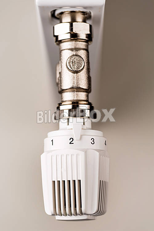 Beschreibung Der Thermostat eines Heizkörpers ist wenig aufgedreht. Niedrige Raumtemperatur spart Heizkosten