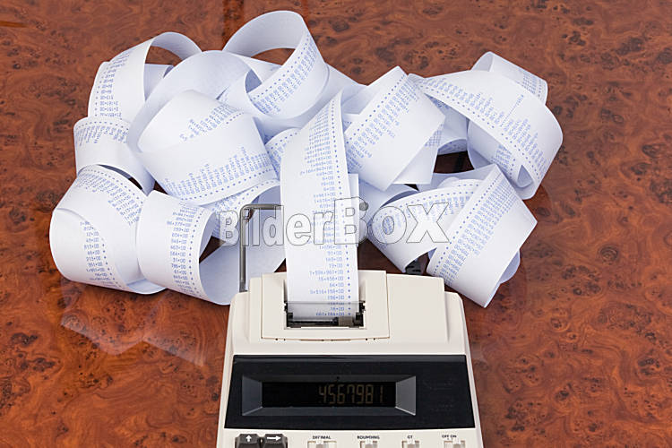 Tischrechner mit Rechenstreifen für Kosten, Ausgaben, Umsatz und