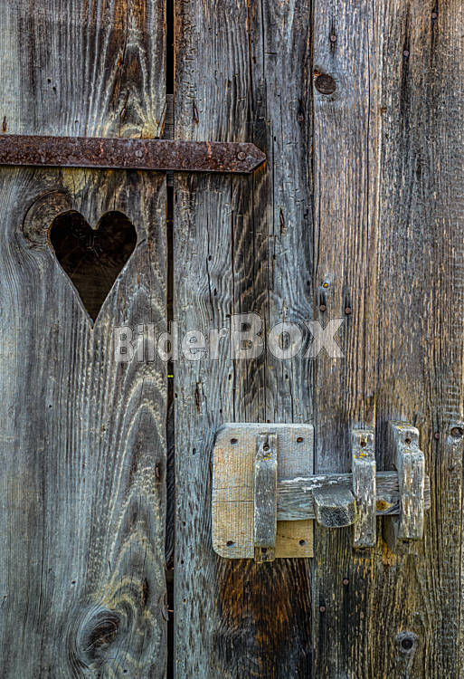 Beschreibung Eine Toilettentüre aus Holz mit Herzerl und Holzriegel