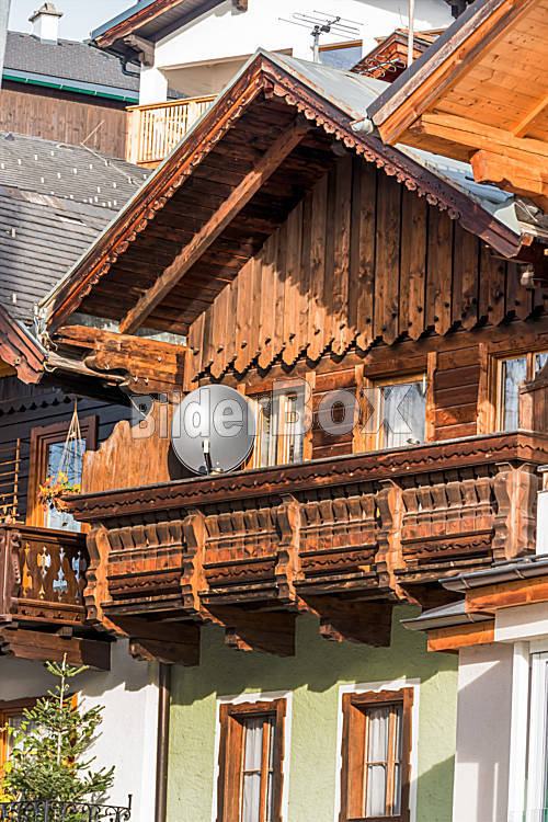 Beschreibung Traditionelles Haus mit Parabolantenne, Symbol für Kommunikation, Rundfunk, Fernsehen, Internet