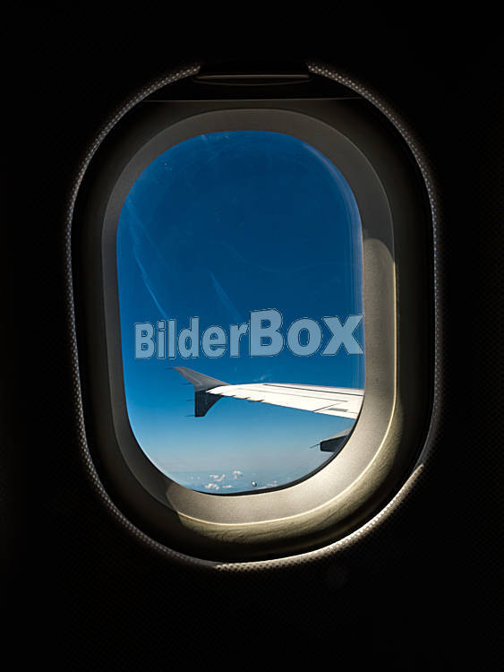 Beschreibung Eine Tragfläche eines Passagierflugzeuges vor blauem Himmel