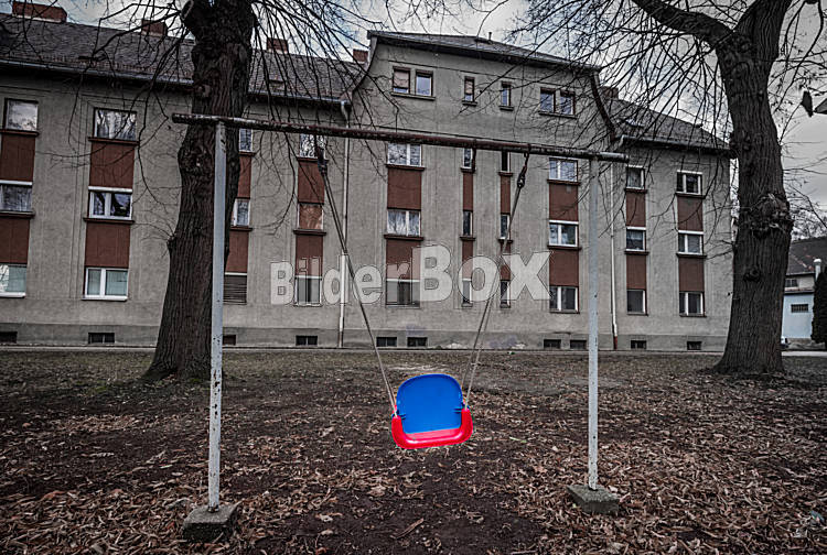 Beschreibung Trostloses Wohnhaus mit Schaukel. Schaukel bringt Farbe in die Umgebung