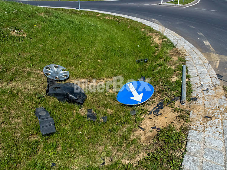 Beschreibung Bei einem Autounfall wurden bei einem Kreisverkehr Verkehrszeichen umgefahren