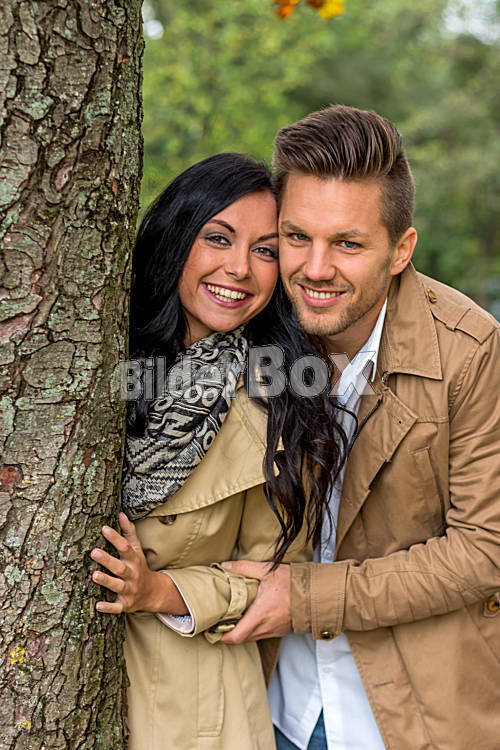 Beschreibung Ein junges, verlliebtes Paar schaut hinter einem Baum hervor