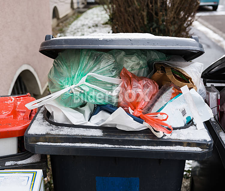 Beschreibung Eine volle Mülltonnen wartet auf die Entsorgung von Müll durch die Müllabfuhr
