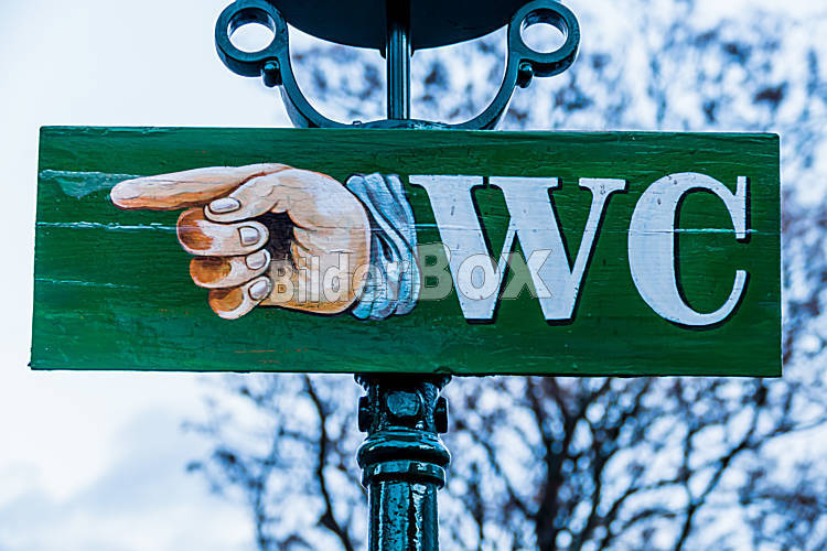 Beschreibung Ein Schild weist den Weg zur nächsten öffentllichen Toilette