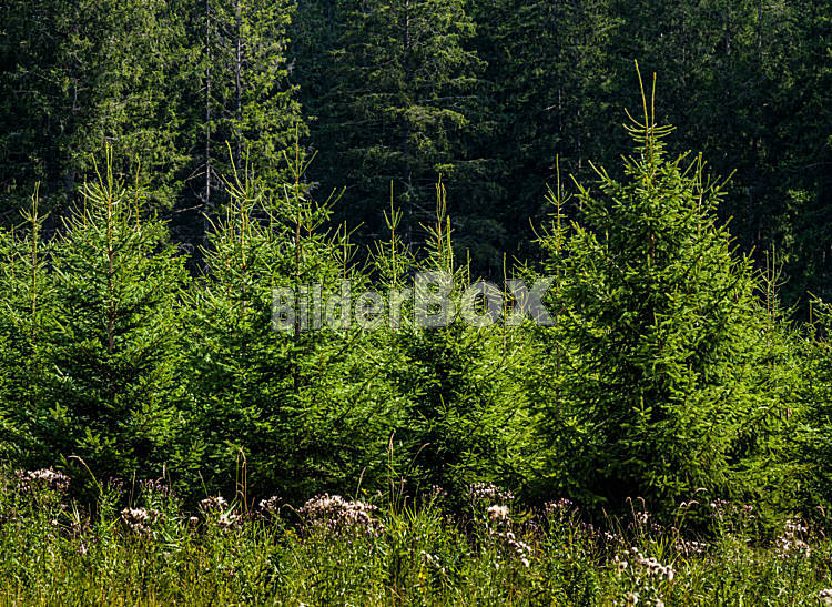 Beschreibung Jagdhochsitz vor Jungwald. Aufforstung von nachwachsenden Rohstoffen