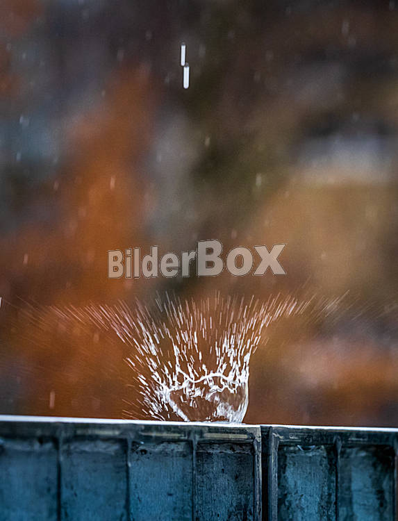 Beschreibung Ein Wassertropfen schlägt bei Regen auf Geländer auf. Schlechtwetter - Wetterbild