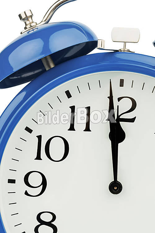 Beschreibung Ein blauer Wecker auf weißem Hintergrund. Fünf vor Zwölf