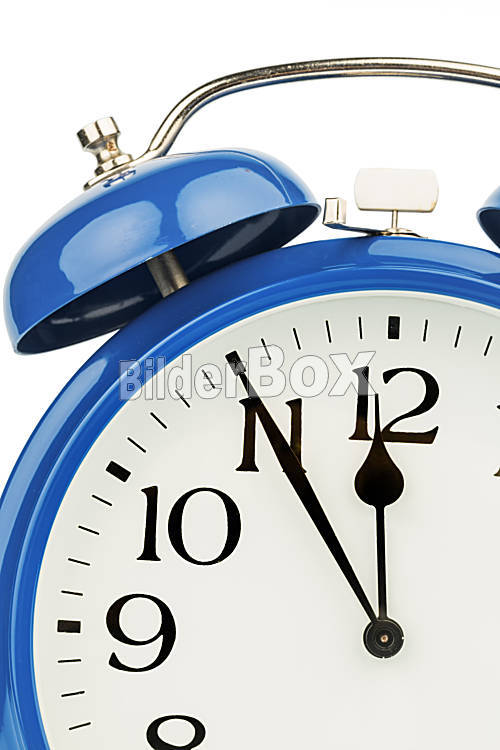 Beschreibung Ein blauer Wecker auf weißem Hintergrund. Fünf vor Zwölf