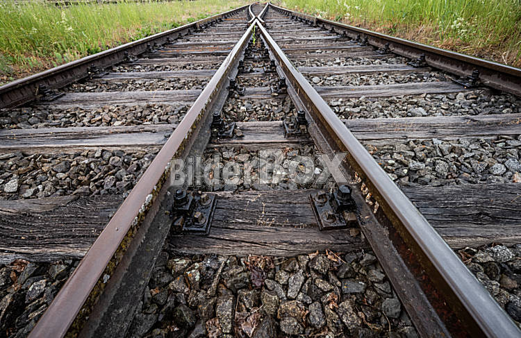 Beschreibung Zwei Gleise laufen aufeinander zu. Weiche einer Eisenbahnstrecke