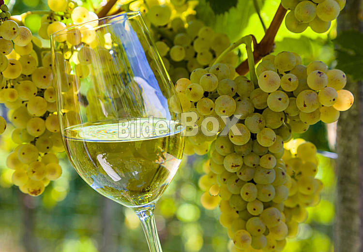 Beschreibung Ein Glas mit Weißwein im Weinberg mit Weintrauben eines Winzers