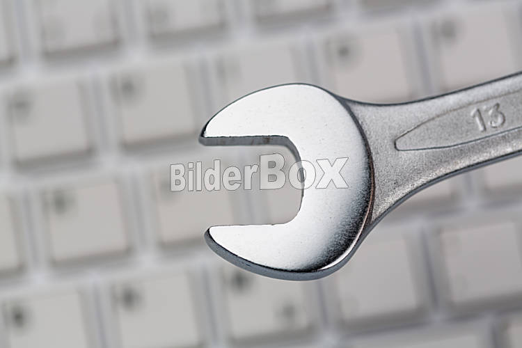 Beschreibung Ein Schraubenschlüssel als Werkzeug auf einer Computer Tastatur. Symbolfoto für Datenschutz, online Kriminalität, und Sicherheit im Internet