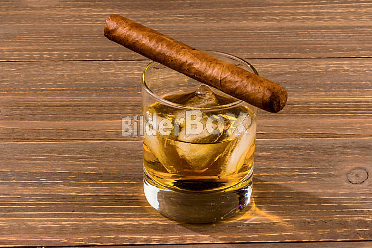 Beschreibung Zigarre und Whisky. Ein Symbolfoto für Sucht und Genuss