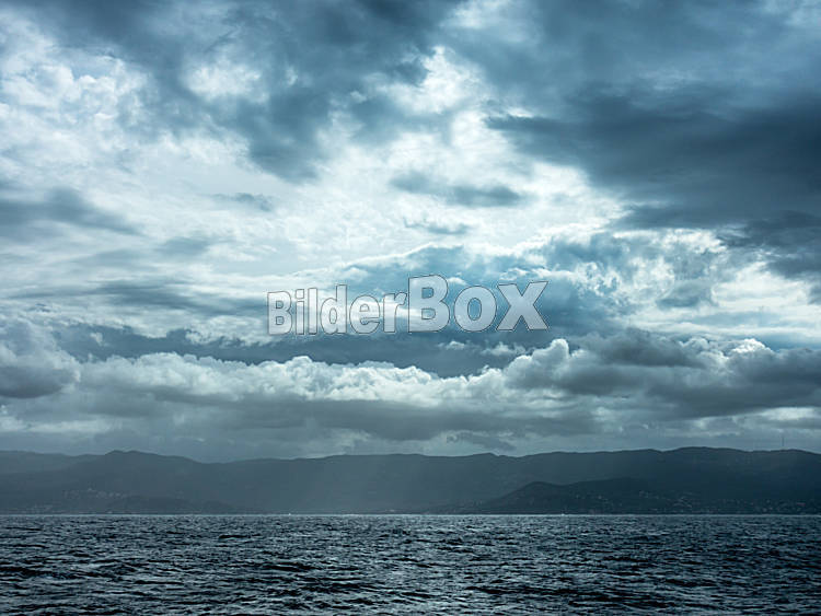Beschreibung Düstere Wolkenstimmung mit Meer. Symbolbild für Düster, unheimlich und bedrohlich.