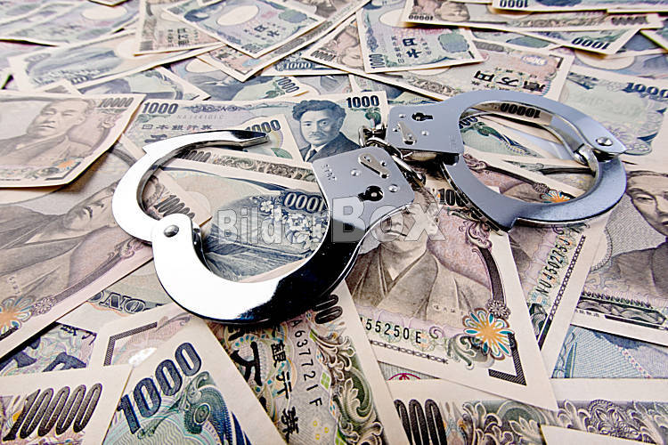 Beschreibung Yen Geldscheine, Währung aus Japan mit Handschellen