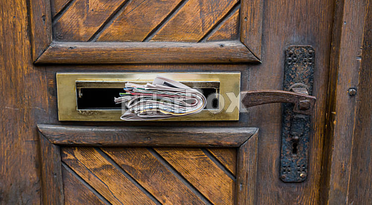 Beschreibung Haustüre mit Zeitungen und Direktmarketing im Briefschlitz