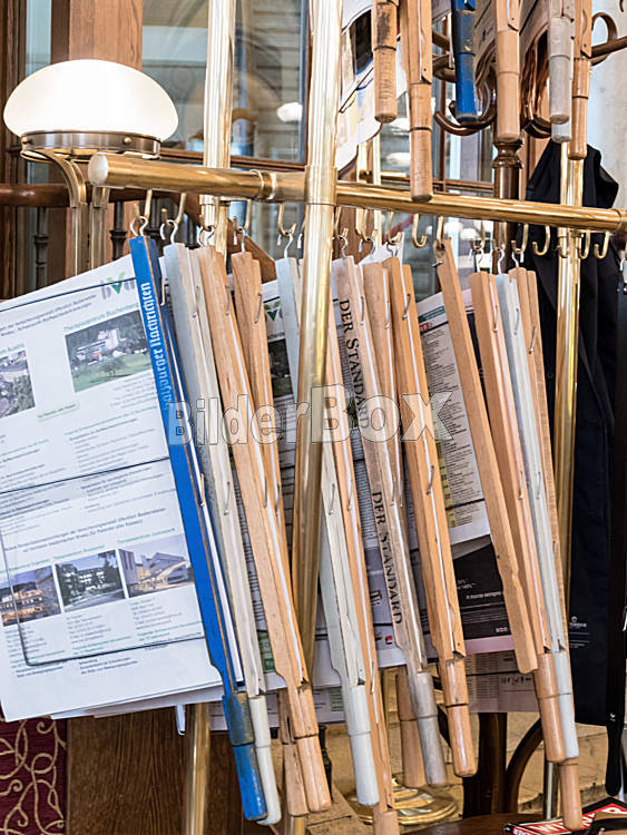 Beschreibung In einem Kaffeehaus hängen viele verschiedene Zeitungen auf einem Zeitungsständer