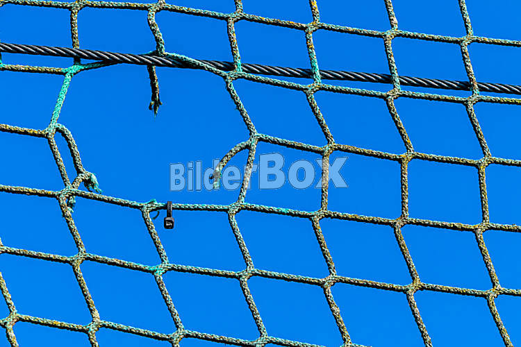 Beschreibung Zerrissenes Netz und blauer Himmel, Symbol für Grenze, Gefangenschaft, Schaden, Hoffnung, Freiheit,