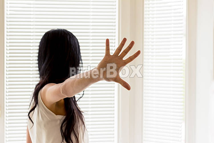 Beschreibung Eine Frau wird belästigt und hält die Hand zur Abwehr