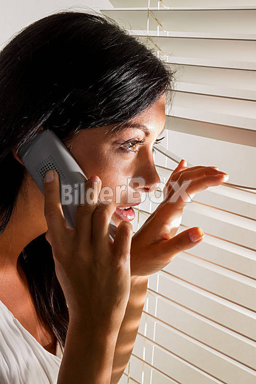 Beschreibung Eine junge Frau beobachtet etwas durch die Jalousie ihres Fensters